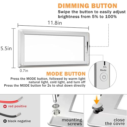 Easily Adjustable Brightness From 5% to 100%:Press the MODE button,followed by warm/natural/cold light and turn off,you can also press and hold the button for 2 seconds to directly turn off the RV LED Interior Light,which is easy to operate.The dimming button is carefully crafted through ergonomic research and design, and is seamlessly fixed on the top, making it easy to activate and set the brightness from 5% to 100% as you want,providing you with a personalized lighting experience.