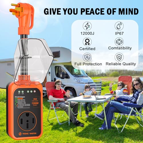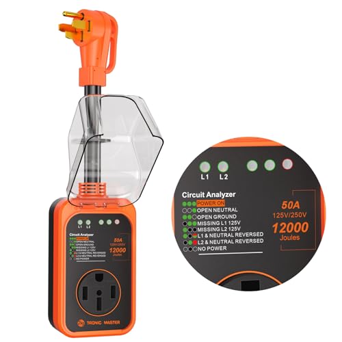 RV Circuit Analyzer: TRONIC MASTER 50 amp RV Circuit Analyzer performs an in-depth inspection of your power source. It features the LED indication guide and diagnostic chart with seven modes: correct wiring, open ground, reverse polarity, open hot, open neutral, hot/ground reverse, and hot on neutral with hot open. An essential tool for RV owners to ensure electrical safety and reliability.