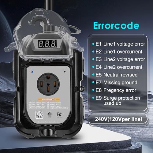 ?RELIABLE SURGE PROTECTOR?The ADSP50WT-1 checks the power supply for 10 seconds before use and automatically cuts off the power and displays the corresponding error code when unsafe voltage is detected. Once the voltage stabilizes, the system automatically resumes operation after a 128-second delay to ensure the safety of the RV's electrical compressor