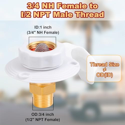 ?Packaging and Size? The RV water inlet connection check valve is with 3/4’’ NH(GHT) female into 1/2’’ NPT male thread, 3’’ white flange, 3 screws,2 Teflon Tape,a filter and an extra flexible rubber dust plug for replacement.