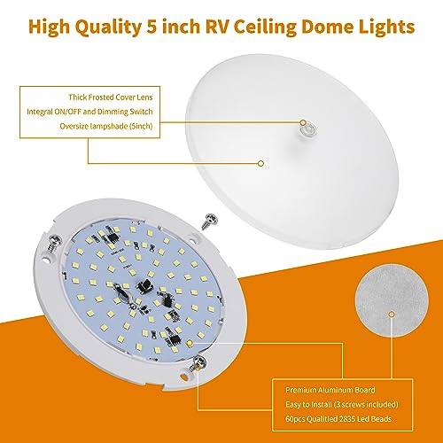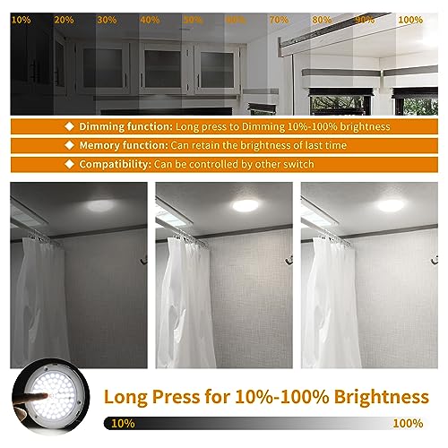 Stepless Dimming 10%-100% - The switch of this RV ceiling light 12v can realize stepless dimming (Long press the switch to adjust the brightness from 10% to 100%). This RV dome light interior lets you choose the level of brightness you're comfortable with (Tips:To avoid light flicker, please do not adjust the light brightness with an external dimmer.)