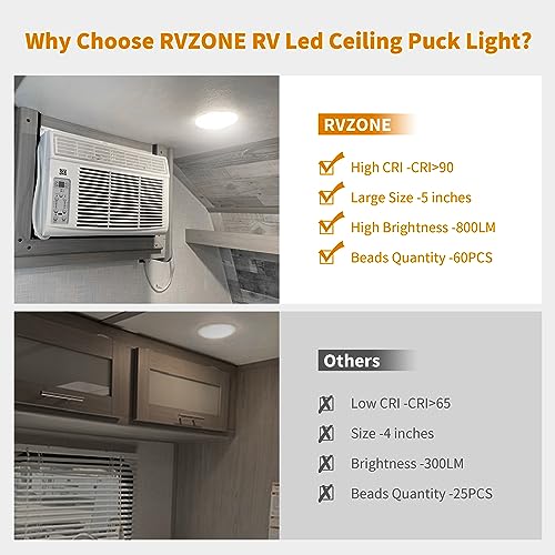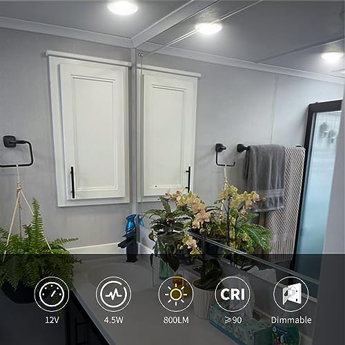 Bright and Energy Saving - RV LED ceiling puck light works on 12V voltage and a power- 4.5W, which saves the power consumption of the vehicle. At the same time, the 12V ceiling light can provide 800 LM brightness and 5500-6500K cool white light, and the service life exceeds 60000H