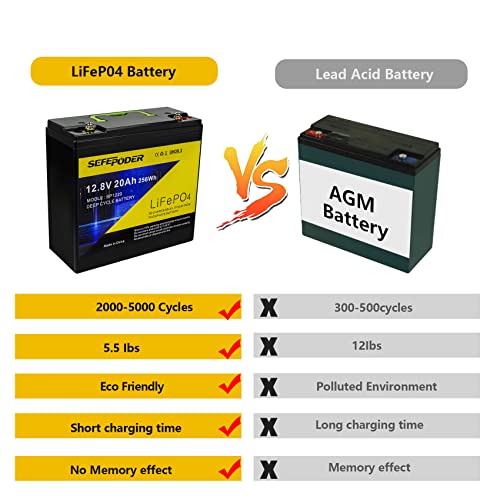 ?Long service life?: Sefepoder 12V 20Ah LiFePO4 battery has a service life of over 2000 cycles, the average life of a lead-acid battery is approximately 500 cycles in two years. Lifepo4 batteries are made from non-toxic, non-hazardous materials and do not contain harmful substances such as acid, making them more environmentally friendly and you can safely install them in any location.