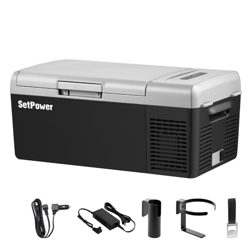Compact Capacity And 42dB Low Noise: Setpower FC15 12 volt electric cooler has a compact capacity of 15.8 quart (15 Liter), can fit 20 cans 335ml Cola. This camping portable pefrigerator can serve you and your family enough food for 4-5 days trips. Due to its mini size, you can place this portable fridge freezer anywhere ,money and space-saving. The noise test of this car portable fridge is below 42db to achieve silent operation, will not disturb your rest