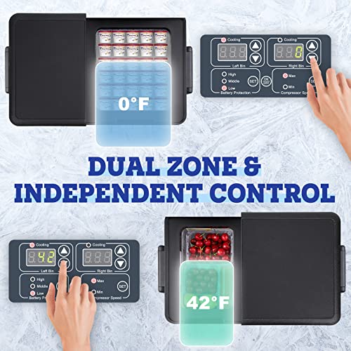 Dual Zone & Dual Temperature Control Electric Cooler--Setpower 12 Volt Refrigerator is equipped with a "true dual zone design" to avoid flavor transfer and mutual contamination of food between the two zones.And,this portable freezer can be independently controlled from 50°F to 0°F via the LCD panel.You can get a refrigerator and a freezer at the same time.