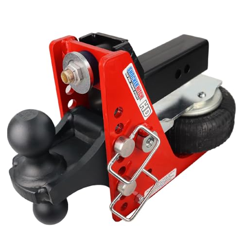Smoother Safer Towing: Air ride towing technology with a heavy duty built in air ride suspension system to cushion the ride & absorb the road shock. Built in HD Air Ride System: Filters the road shock, bumps, bangs, jerks & tugs through the air ride system creating a safer, smoother ride. Plus the shock dampening action naturally reduces tendency to trailer sway. Dual rubber bump cushions also offer additional HD performance. 8 Adjustment Holes: Adjustment for combo-ball mount is 1/2? to 4-1/2?