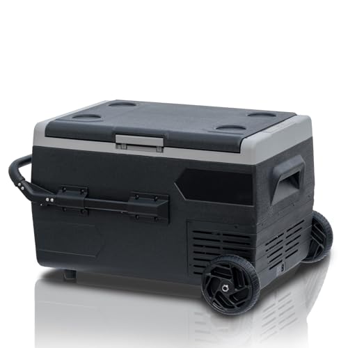 Compact Size and Large Capacity: The car refrigerator’s exterior size is 27.2”Lx18.3”Wx16.5”H with 50L(53 Quart) capacity, fits 32 cans of Cola, This portable refrigerator with retractable handles and large 5-inch wheels is perfect for outdoor use. It’s a great 12 volt rv fridge or freezer for picnic, barbecue, camping, travel