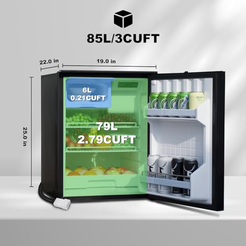12v RV Refrigerator : This SMETA 12 volt car refrigerator with freezer is designed compact perfectly for RV, easy to install, reliable operation of compressor system, electronic temperature control device temperature stabilization?23?--32?--50?(-5?-10?), The refrigerator/freezer side takes less than 10 minutes to cool up. Product size: 19W* 22D*25H, Refrigerating compartment: 2.7cu. Ft (79L),freezer capacity: 6 L