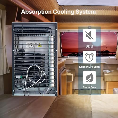?Notes?The RV Refrigerator is absorption cooling instead of compressor. It works totally silent and takes 8-10 hours to cool on first use. Please keep the fridge standing 24 hours before use. Once the temperature of the DC refrigerator reaches the set temperature, it will be powered off and no longer consume electricity.