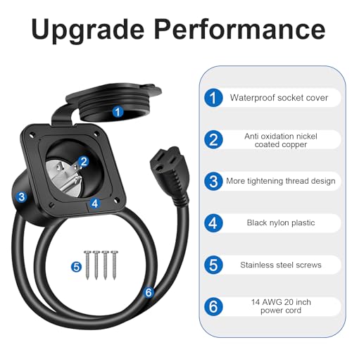 ?Waterproof Power Inlet?This shore power plug is made of high quality copper and nylon plastic. Front and back protective covers keep out heavy rain, snow and dust for outdoor use.