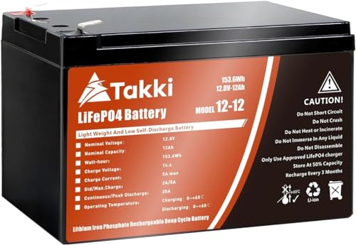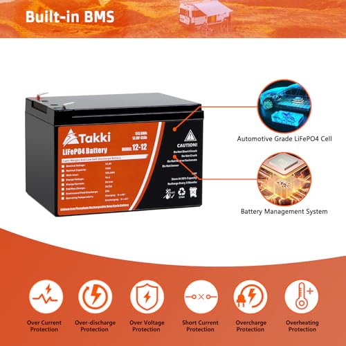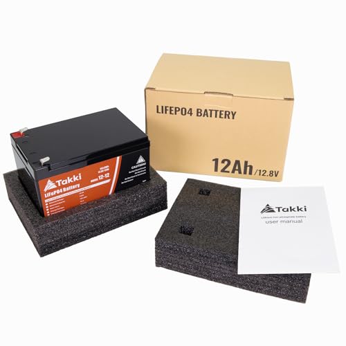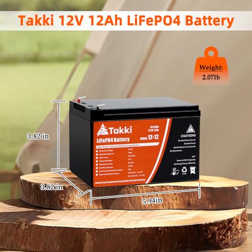 Upgraded BMS and Battery Cells : Takki 12V 12Ah LiFePO4 batteries will not burn when overcharged, overdischarged, overcurrent or short-circuited, and can withstand high temperatures without decomposing, with built-in 6 BMS protection against overcharge, overdischarge, overcurrent and short-circuit circuits, and very low self-discharge rate. Can be connected in series or parallel, up to 4 identical batteries in series.