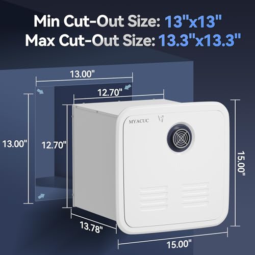 HIGHLY ADAPTABLE - The RV tankless water heater is compatible with most RVs, with a 13" x 13" body and an included door measuring 15" x 15", can perfectly replace the common 6-gallon tank water heater. Inlet and outlet water connections are 1/2" Female NPT, gas inlet is 3/8" Male NPT. The heater requires 12V DC power supply, please check and measure these parameters carefully carefully before you purchase