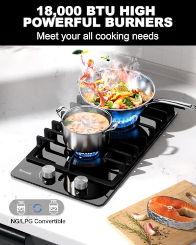 18,000 BTU Gas Propane Cooktop - Equipped with two sealed burners with power outputs of 6,000-BTU and 12,000-BTU, which can be adjusted independently to meet various cooking needs. Pre-installed for natural gas, with included LPG nozzles for easy conversion, it effortlessly handles a variety of cooking scenarios