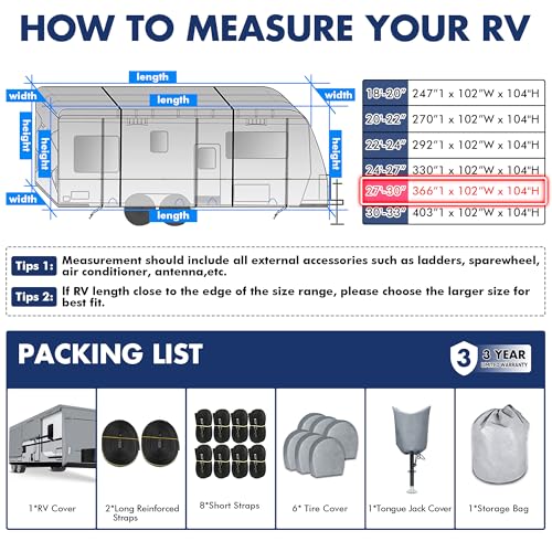 Wide Range Of Accessories: Fits RV 27'-30'. To ensure installation, please measure your RV before purchase. Included. 1*travel trailer cover, 1*storage bag, 1*jack cover, 2*wind straps, 6*tire cover