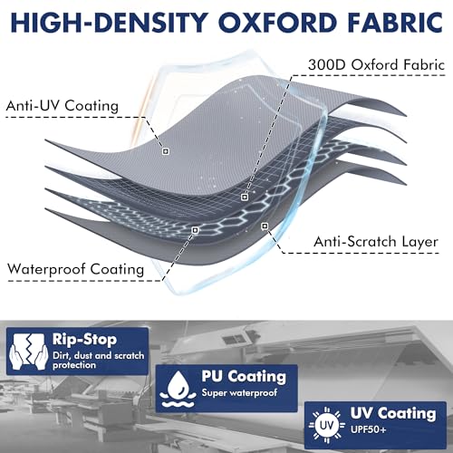 Upgraded Tear Resistant fabric:The travel trailer cover is made of upgraded high-strength Oxford fabric, the top fabric is made of upgraded 300D Oxford fabric material and the sides are made of 210D high-density Oxford fabric. With waterproof coating and anti-UV coating, it has better waterproof and durability than non-woven fabric.