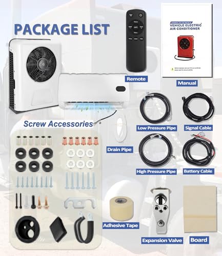 Powerful Brushless Motor - Equipped with brushless 960W motor up to 3000RPM, this 12V mini split cools down the interior temperature rapidly with wind speed 265CFM and operates at low noise(45dB), create a comfortable and quite space in a short time. Truck Driver's Partner - Indoor Unit Size: 23*13*7inch; Outdoor Unit Size: 20*9*26 inch(???????????? ???????? ???????????????????????????? ????????????????????????????????????????????????, ???????? ???????????? ???????? ???????????? ????????????????). Fits Trucks, Semi Trucks, Cabover Semi Truck, Container Semi-truck, Tractor-Trailer, Boats, RVs, Vans, Excavators, Passenger Cars, Agricultural Vehicles, Engineering vehicles etc. Variable Frequency Inverter Cooling - 12V Mini Split Air Conditioner adjusts its operating frequency according to the surrounding temperature, hence reducing energy consumption. The inner unit is equipped with an ultra-quiet mini evaporator, it controls temperature intelligently and operations below 45dB to create a comfortable environment 12V DC Power Supply & Low Voltage Protection - The 12 volt ac cuts off automatically to stop the battery from running out power, which ensures the car could start as usual. There are over-voltage and over-current protection as well, safe and worry-free! Long-Lasting - Made from sturdy ABS, the shell enjoys excellent resistance to deformation and corrosion, our 12 volt air conditioner ensures long-lasting durability. The package includes internal and external units with both accessories and instructions, ensures a quick and easy installation.