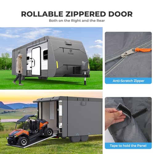 ?Thoughtful Design??Our utility RV covers feature 4-6 ventilation openings, effectively expelling internal moisture. ?The trailer cover includes 5 zippers, with 2 zipper doors on the right and 2 zippers at the rear that can be rolled up for easy access. ?The travel trailer cover's front and back are equipped with 4 reflective strips, ensuring safety during outdoor night. ?4 pairs of adjustable windproof straps on the front and back can be adjusted to fit different RV shapes more securely.