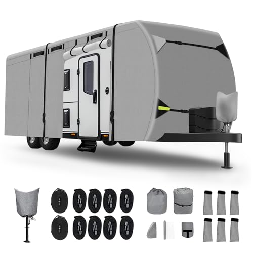 Bsteciar Upgraded RV Cover Kit & 3 Years Warranty -- Package including RV Trailver Cover ×1, Gutter Spout Cover ×6, Tongue Jack Cover ×1, Extra Long Windproof Straps ×2, Front and Rear Windproof Straps x 4, Bottom Windproof Straps x 4, Ladder Cover ×1, Adhesive Repair Patch ×1, Storage Bag ×1, Throwing Bag ×1. 30-days money back without questions.If There Is Any Quality Problem, Please Contact Us First, We Will Solve It For You Quickly Within 24 Hours.
