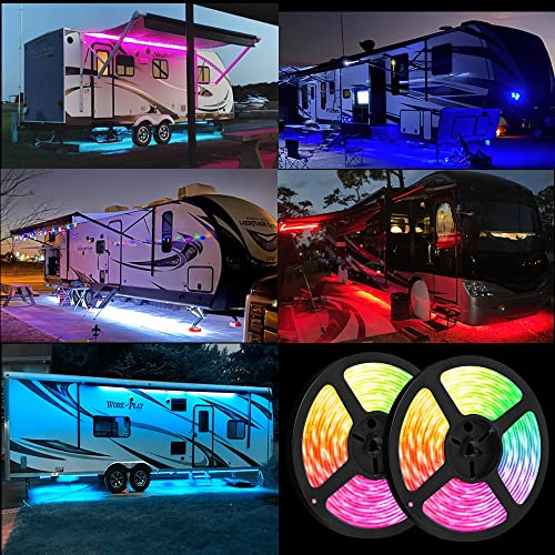 Bluetooth RV Underbody Lights : RV Underglow Lights are Special Designed for RV, Camper, Motorhome, Travel Trailer, Concession Stands, and Food Trucks,40FT long lights with extension cable are use for most of RV underglow,great to light up your RV and will look very beautiful,you can play card,game or party with your family or friends, IP65 Waterproof, Shockproof, Design to Withstand Harsh Weather Conditions.