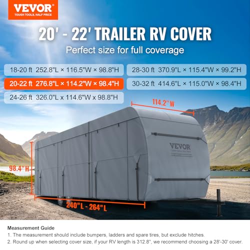Perfect Fit 20'-22' RVs: Our travel trailer cover is great for 20'-22' RVs, measuring 276.8"L x 114.2"W x 98.4" H. Ensure a precise fit by measuring your RV, including bumper, ladder, and spare tire (excluding hitch). We provide a wide range of camper covers, so you'll always find the perfect size for your RV.
