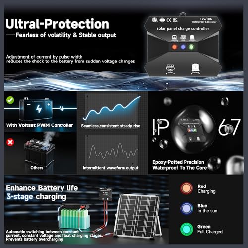 Safety Controller: Equipped with an efficient charging controller, our solar panel system ensures your battery isn’t overcharged. The controller stops charging when the battery is full and resumes charging when voltage drops. Plus, it doesn’t drain battery power (IP67 waterproof)