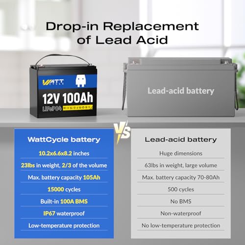 ????BCI Group 24: WattCycle lithium battery is a mere 10.2x6.6x8.2 inches (26x17x21cm) and weighs only 23.2 lbs (10.5kg), and it is perfect for BCI Group 24 battery box. Our battery boasts a compact form factor that maximizes energy density.