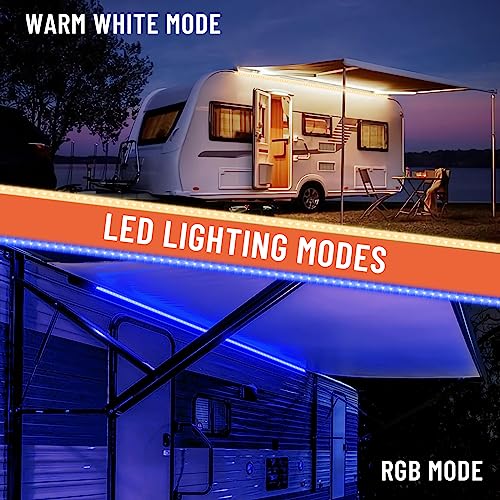 Colorful Awning Lights for RV Canopy: Two lighting modes: warm white and RGB modes. You could create all kinds of different situations atmosphere with color changing lighting. The brightness is adjustable. Just enjoy your time!