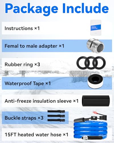 Package Include: 25FT heated water hose x 1 ---- Instructions x 1 ---- 3/4" adapter x 1 ---- Waterproof tape x 1 ---- Rubber ring x 3 (Prevent water leakage) ---- Buckle straps x 3 (for easy storage) ---- Anti-freeze insulation sleeve x 2, Matching 3/4" solid brass adapter fitting allows the hose to be used with 120V power supply