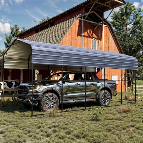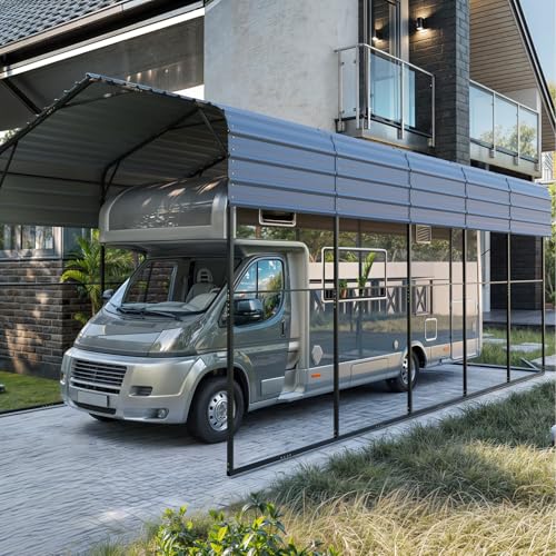 Durable & Stable Design: Built with a 0.5mm galvanized steel roof, 24 powder-coated 2"x2" steel posts, and 25 reinforced support rods, this carport ensures exceptional strength and corrosion resistance. Enhanced by steel wire cables, it prevents tilting or collapse, offering reliable protection for RVs, cars, trucks, boats, and tractors